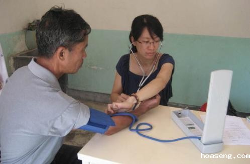 医技学院“枫爱同行,连江之行”实践队的带队老师吴永芳在关爱老年人心血管活动中为当地老人测血压
